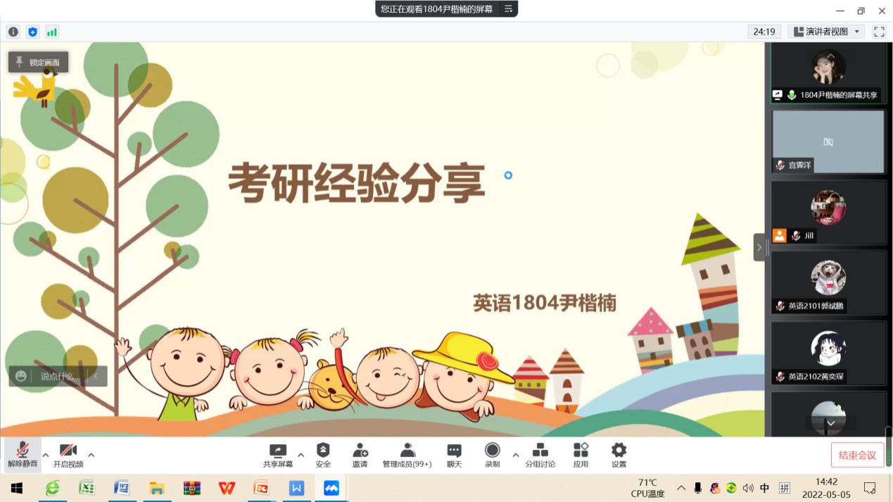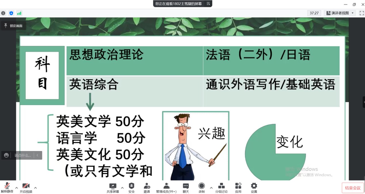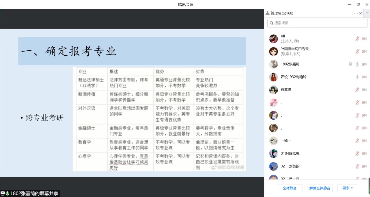 2022年5月5日下午,BEAT365英国官网英语专业通过腾讯会议召开了考研暨就业交流会。会议由教学部主任王静老师主持,邀请2018级9位成功考取硕士研究生以及顺利就业的学生交流心得和分享经验,2019级、2020级以及2021级170余名学生与会交流。学长从选择考研学校和专业、复习备考、调剂学校、就业和备考教资五个方面分享了自己的经验,并鼓励学弟学妹们平时注重知识积累和能力培养。