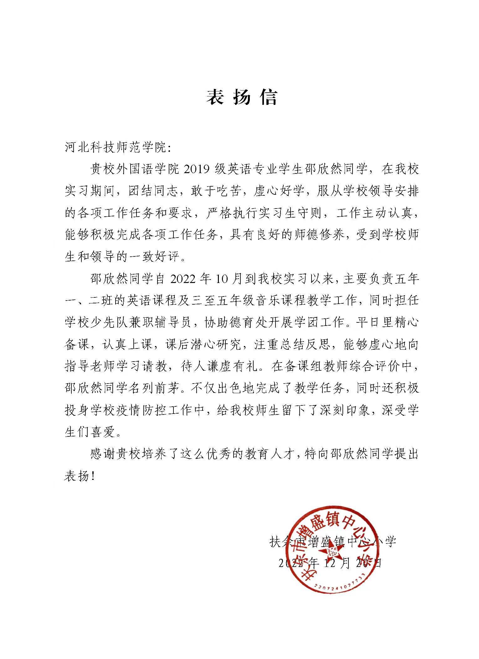 近日,吉林省扶余市增盛镇中心小学向BEAT365发来表扬信,感谢BEAT365英语专业邵欣然同学在该校出色地完成顶岗实习任务。