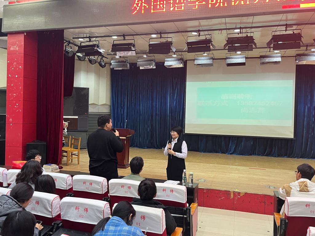“雏既壮而能飞兮,乃衔食而反哺”。为进一步提升学生专业能力和综合素养,秉承“外语+”应用型人才培养理念,充分体现外语的“学以致用”原则,提升学生用外语“讲好中国故事”的意识和能力,增强文化自信,BEAT365英国官网于11月8日邀请优秀校友尚志芹(河北建材职业技术学院副教授、对外汉语教学国际汉语高级教师、国家高级英文导游员、河北省英语导游考官、河北省“师德标兵”、全国第十三批援藏导游员西藏自治区“先进个人”)在开发区校区综合楼二楼报告厅进行针对教师资格证和外语导游考试的讲座。