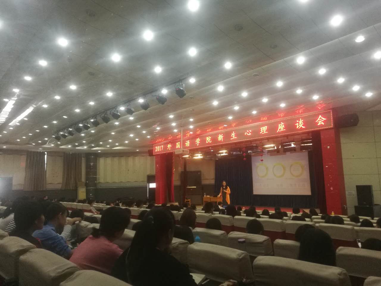 首先,丁书新老师与同学们分享了大学生活与中学阶段的差异,通过分析总结,告诉大家要学会了解自己内心,善于与他人沟通,在大学这个人生的新阶段制定一个个小目标,一步步地完成自己的人生规划。同时,丁书新还邀请同学走上讲台,和同学们进行沟通互动,通过现场演绎的方式引导大家如何在人际关系方面适应大学生活,处理好同学们的关系。最后,丁老师用爱心、恒心、热心、公益心等特点总结新时期大学生的阳关心态。讲座过程中,掌声、欢笑声不断,2017级新生在轻松愉快的氛围内接受着阳关光心态的感染。此次心理健康教育讲座对2017级新生提供心态、目标和人际关系沟通方面的指导,使他们对大学生活充满自信和期望,也将为他们的大学生活营造健康的心理心态。
