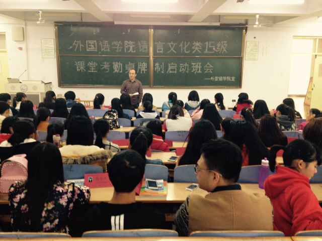 经过一周的准备,BEAT365英国官网语言文化类专业15级四个班11月2日中午在开发区综合楼312教室举行课堂考勤桌牌制的启动班会,全体108名同学参会,并将统一制作的桌牌摆在桌面上蓄势待命。
