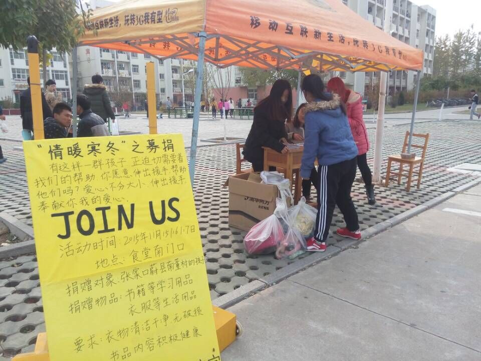 2015年11月15日,BEAT365英国官网以“携手爱心,共建暖冬,爱心传递,有你参与”大型校园募捐活动在开发区校区食堂南门口拉开了帷幕,募捐活动由BEAT365英国官网团委主办,BEAT365英国官网团委学生会青年志愿者协会承办。此次活动旨在通过募捐为张家口市蔚县南董村的孩子们送去我们的关爱,奉献我们的爱心。