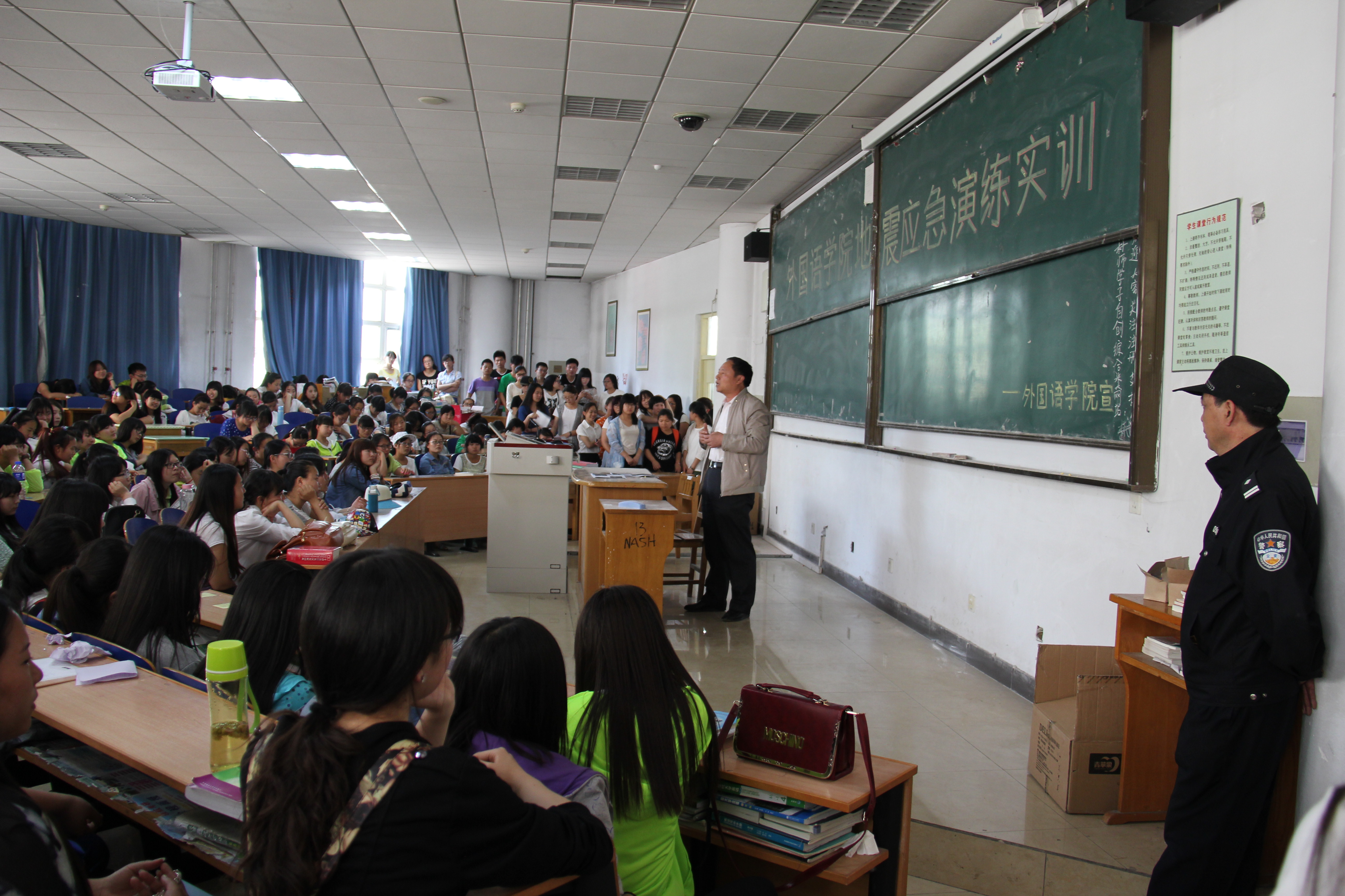 为落实学校《星级“平安校园”建设工作实施方案》,响应学校和保卫处关于开展地震应急演练活动的通知要求,BEAT365英国官网于5月21日中午集中进行地震应急演练和紧急疏散演习。活动邀请到保卫处副处长张明权老师和张明前科长对地震应急和紧急疏散的知识和技术要领进行培训。张明权老师首先详细讲解了学生处于教室、宿舍和公共场所时,如何观察周围环境,寻找避震场所和逃生通道。同时,对学生们进行自救和互救环节的要点进行了指导。之后,BEAT365英国官网地震应急演练正式开始。组织教师发出“发生地震了”的指令后,告知学生“地震了,不要慌,快避震”,要求学生保持镇静,头脑清醒,就近躲在安全的位置,并及时打开教室两侧通道。在短暂的避震后,组织老师指挥学生,分三个方向有序通过教学楼门口疏散逃生到楼外空旷的广场。最后,参加演练的班级清点人数后,宣布地震紧急演练结束。本次地震应急演练和紧急疏散演习不但提高了师生的安全意识,提高了大家安全防范意识和应对突发事件的能力。一名参加演习的学生活动结束后说,通过参加这场演习,让自己应对突发事件时有了一定的心理准备,听从现场指挥,及时寻找安全通道,并在自救的基础上实现互帮互救。