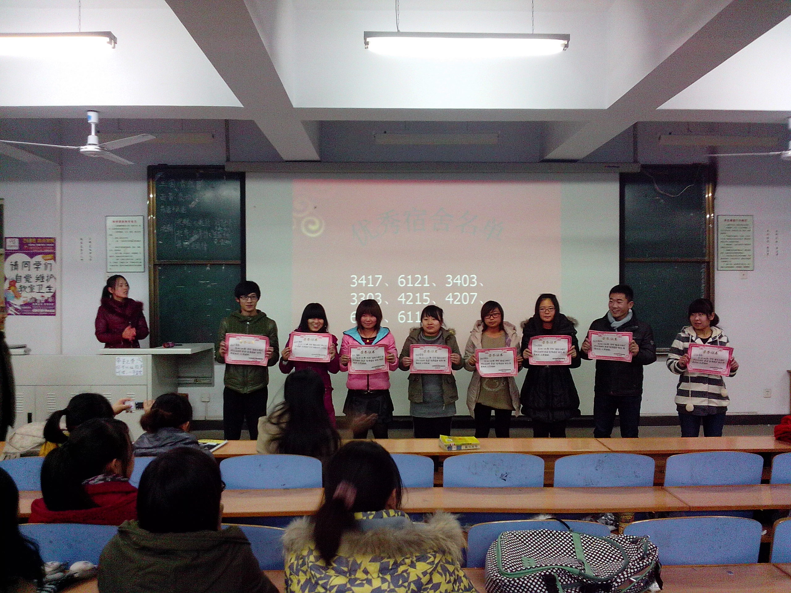 本次表彰大会共评出优秀文明宿舍8个,分别是3417、6121、3403、3303、4215、4207、6107、6112。大会向同学们展示了优秀宿舍的照片,田辉老师为获奖宿舍颁发奖状,并作了简要讲话。大会还成立了由学工办老师和学生会组成的宿舍督查小组,将不定期对学院宿舍内务情况进行抽查。