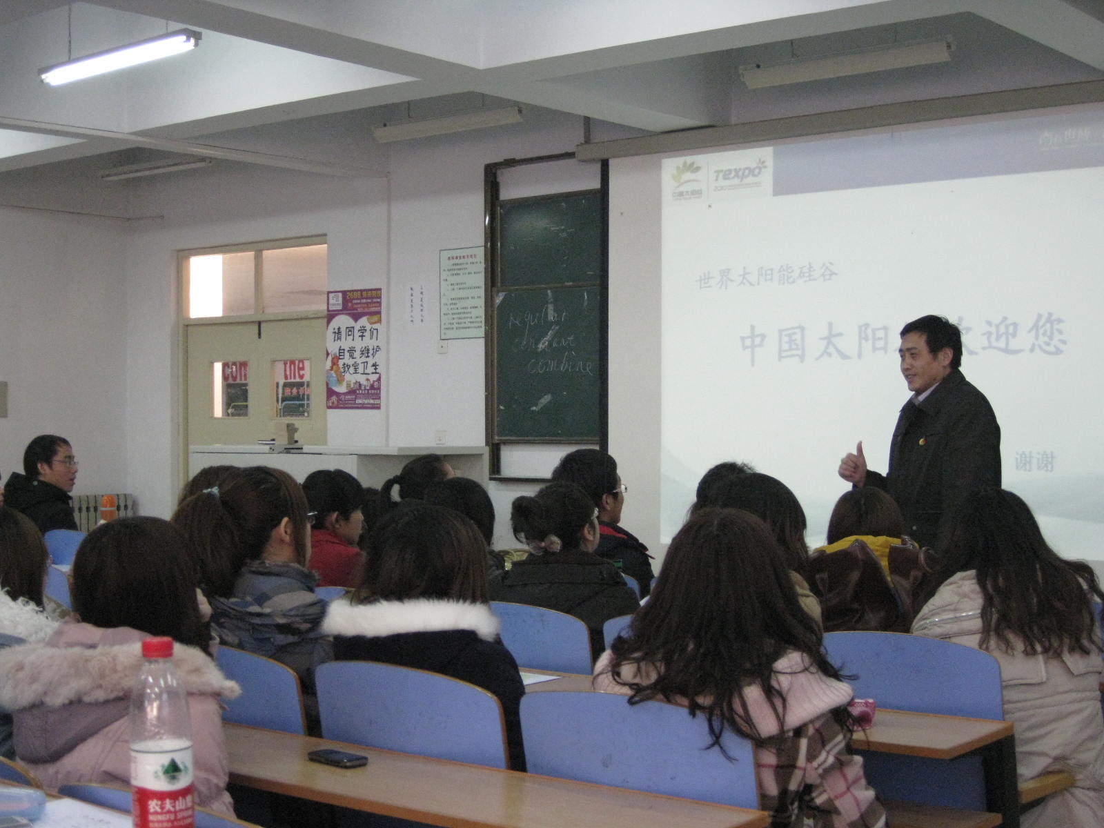 首先,皇明太阳能股份公司的招聘代表佟女士为毕业生播放皇明太阳能“太阳谷”的宣传片,之后将皇明太阳能股份有限公司的公司规模、产品研发、产业布局、发展前景、招聘岗位、基本待遇等情况向毕业生做了较为详细的讲解,并诚挚的邀请BEAT365英国官网的学生加入皇明,同时也欢迎大家有机会去皇明公司参观考察和实习。讲解后,刘朝晖书记代表学院欢迎皇明太阳能股份有限公司佟女士一行,并谈到自己去皇明公司考察的经历,要求全体毕业生转变观念,面向市场。通过对行业和企业的分析,鼓励大家去皇明太阳能实习就业。