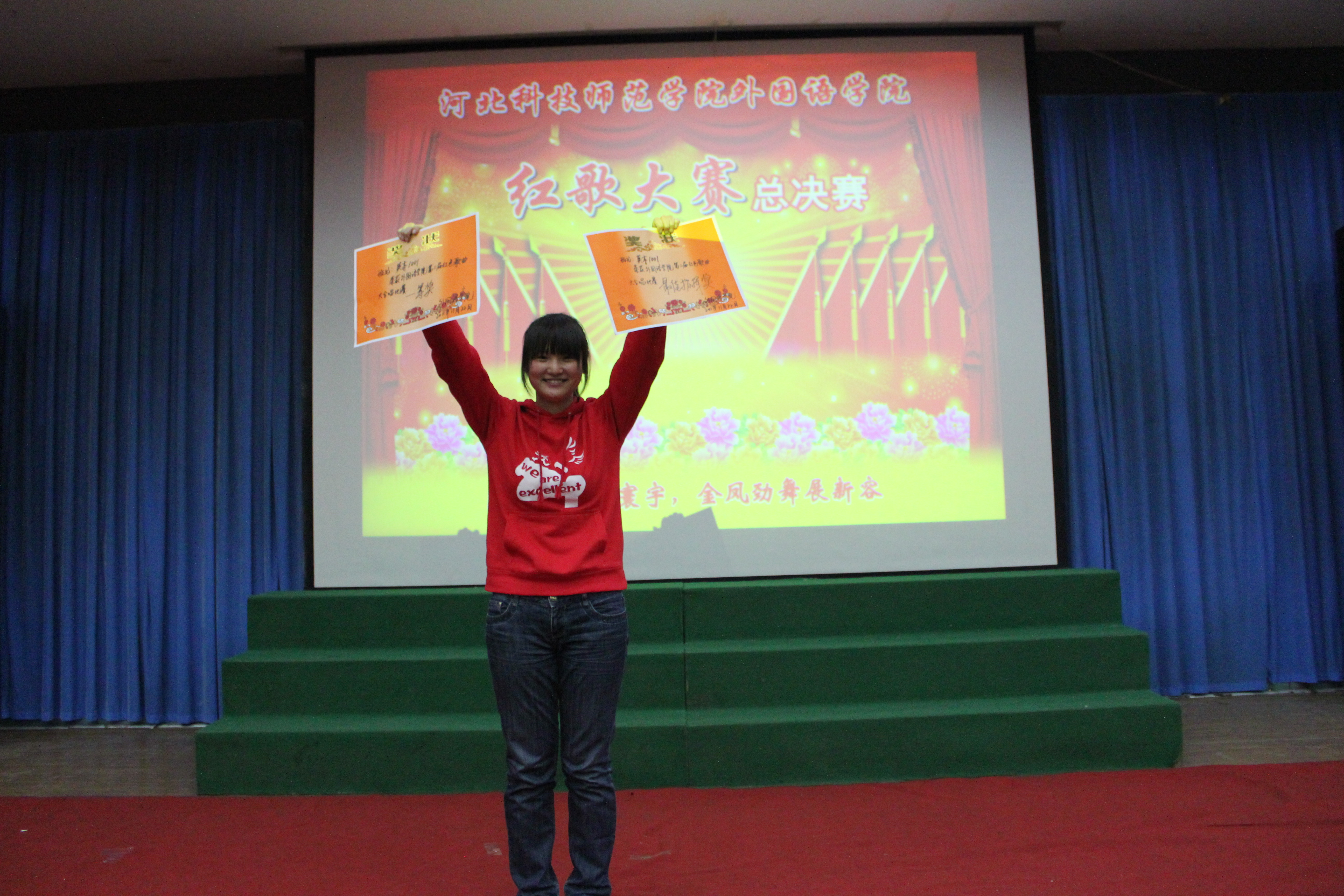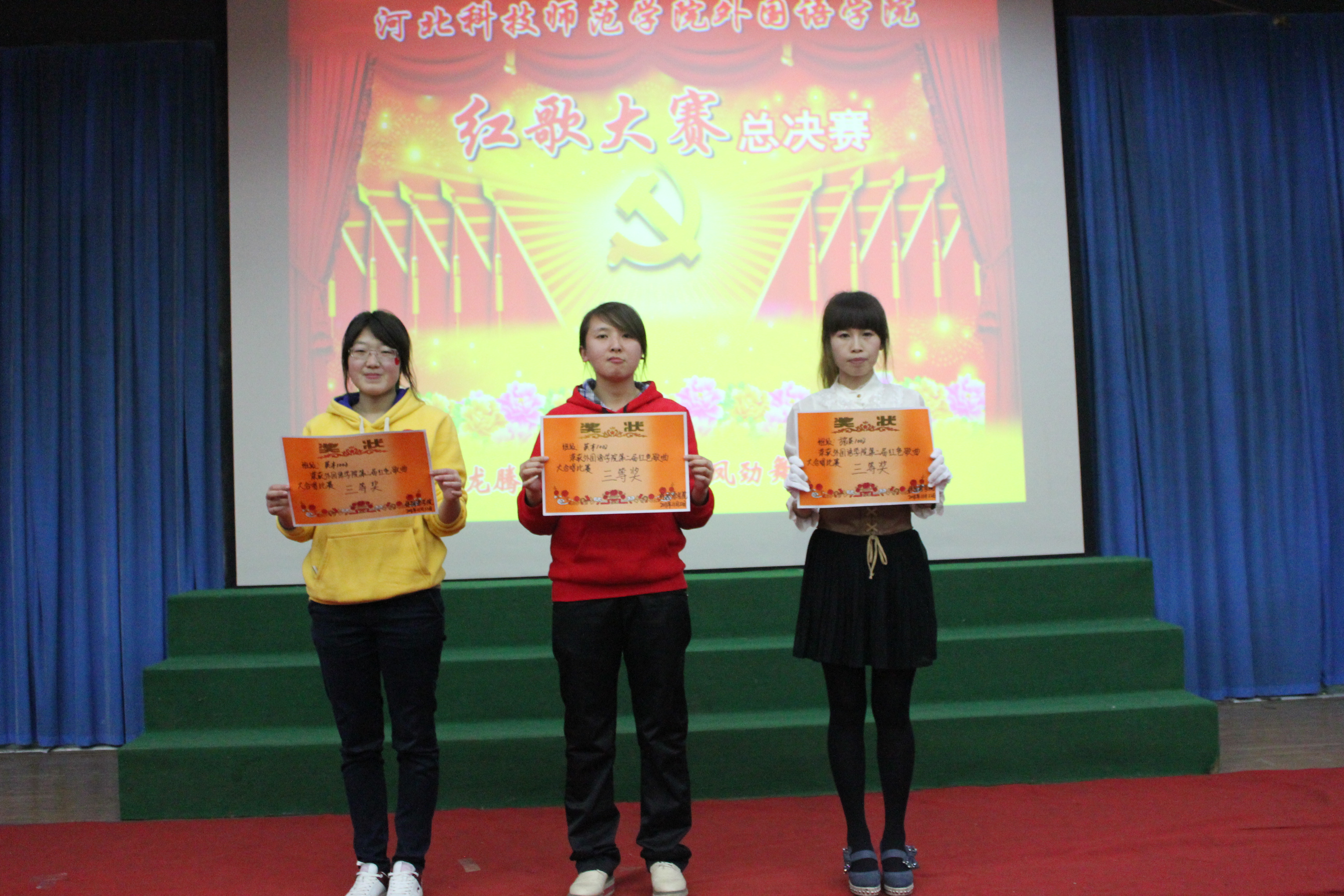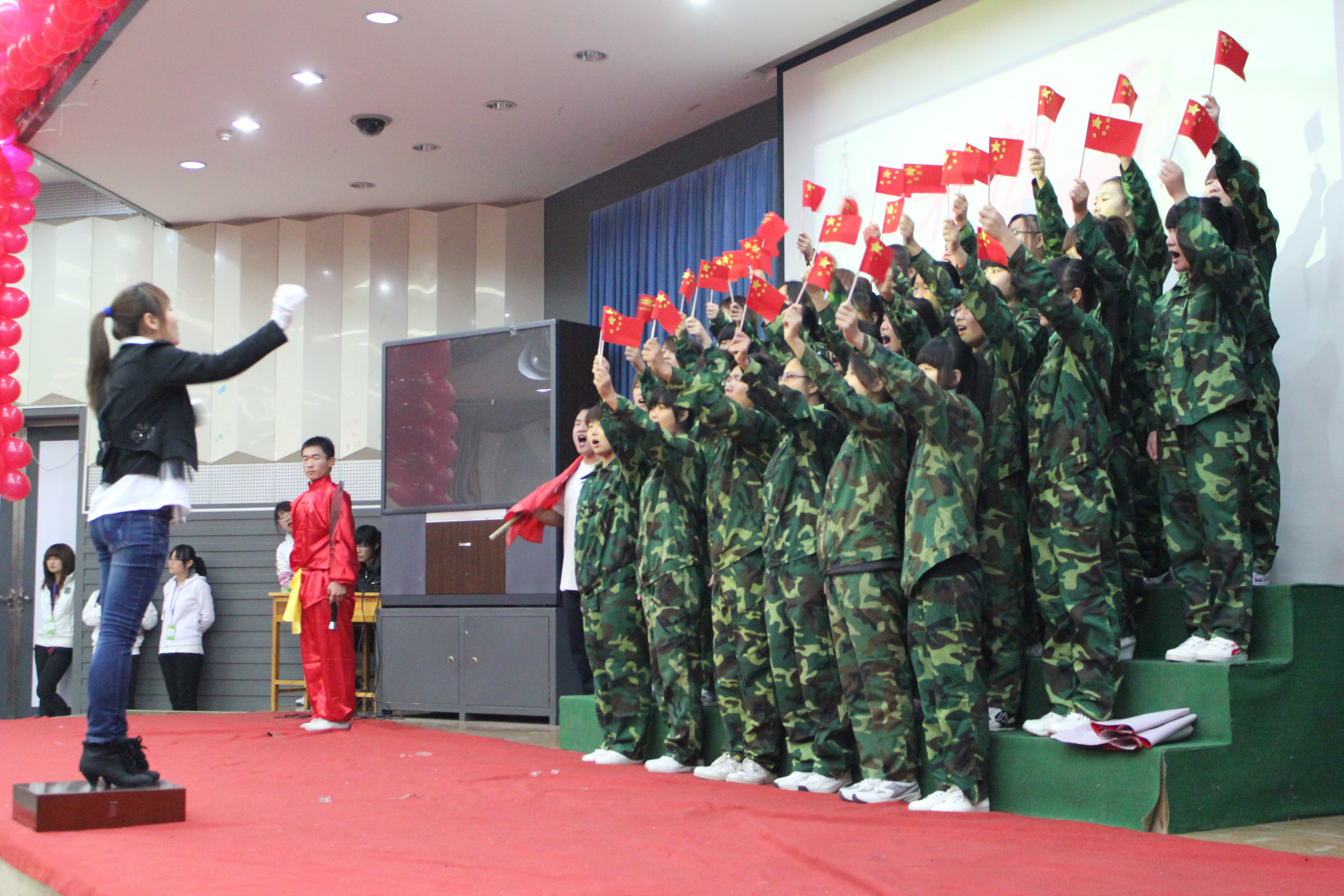 比赛在观看国庆大阅兵的庄严氛围中隆重开幕。参加比赛的班级为师生们带来了一场别开声面的视听盛会,比赛中学生们激情饱满,活力四射。旋律优美动人心弦,歌声嘹亮铿锵有力。《红色娘子军》、《国家》等一首首耳熟能详的红色歌曲唱出了同学们敢为人先,争创一流的时代风采,激起了大家对党对祖国的无限热情。手语、朗诵、武术、歌曲串烧、短话剧等多种多样的形式把比赛一次次推向高潮,台下不时爆发出热烈的掌声和激情的呐喊声。经过激烈的角逐,英本1001班最终以总分第一的成绩荣获桂冠,旅游英语1002班及英本1002班获得季军。