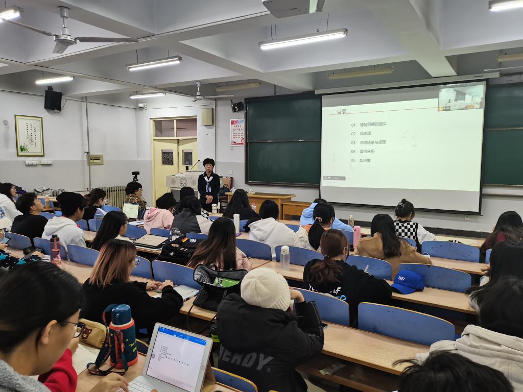 陈慧英老师首先以“如何做一名合格的人民教师”为题向学生们提问,引发学生们思考教师教育的内涵,并借由《道德经》中德的体现及《说文解字》对德的剖析,启发学生们进行个性化思考:什么是德?什么是师德?之后陈老师从教师职业道德相关的法律法规入手,以先贤孔圣和习近平总书记的师德观为例,解读如何树立科学、正确的师德观;通过对十则显性的负能量案例与隐性的负能量案例的具体分析,引导同学们设身处地地思考做一名好老师应该具备的条件;并通过河北农业大学李保国教授的先进事例,鼓励同学们向李保国教师学习,恪守职业道德,积极奉献社会;此外,陈老师还指出作为老师应时时刻刻注意慎言慎行慎独。最后,陈老师就“如何做一名一生受学生爱戴的好老师”进行了五方面的阐释:牢记立德树人的使命,做有理想信念、有责任担当的老师;树立终身学习意识、做有扎实学识的好老师;爱岗爱生,做有仁爱之心的好老师;廉洁从教,做有底气、有骨气、有正气的好老师;树立团结协作意识,处理好与他人的关系,做有大局意识的好老师。