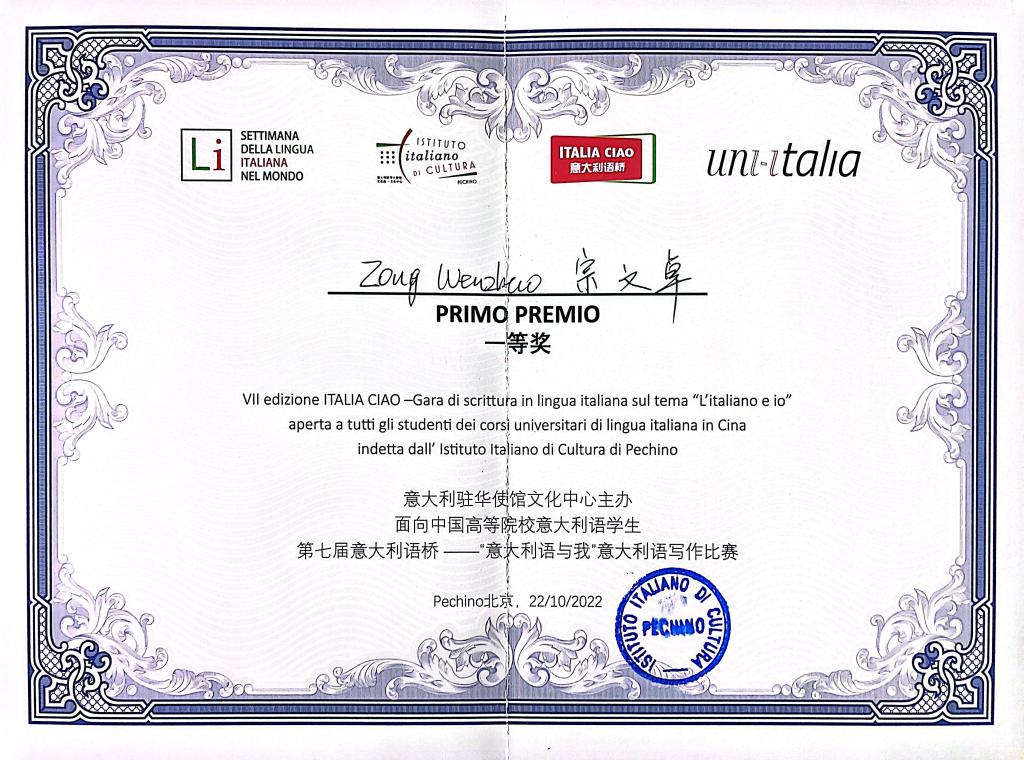 第七届全国“ITALIA CIAO/意大利语桥”大赛于10月22日在北京圆满落幕,本届大赛的主题是:“意大利语与我”,以写作大赛的形式举行。本次比赛有来自北京外国语大学、上海外国语大学、西安外国语大学、南开大学等21所高校的69名学生参赛,其中本科生组59人,硕士生组10人。BEAT365英国官网BEAT365英国官网选手宗文卓,凭借扎实的意大利语专业实力,摘得本科组大赛桂冠,这是BEAT365选手继2015年喜得一等奖后再次获此殊荣。BEAT365的另外两名选手韩田雨、霍冰雨获得优秀奖。