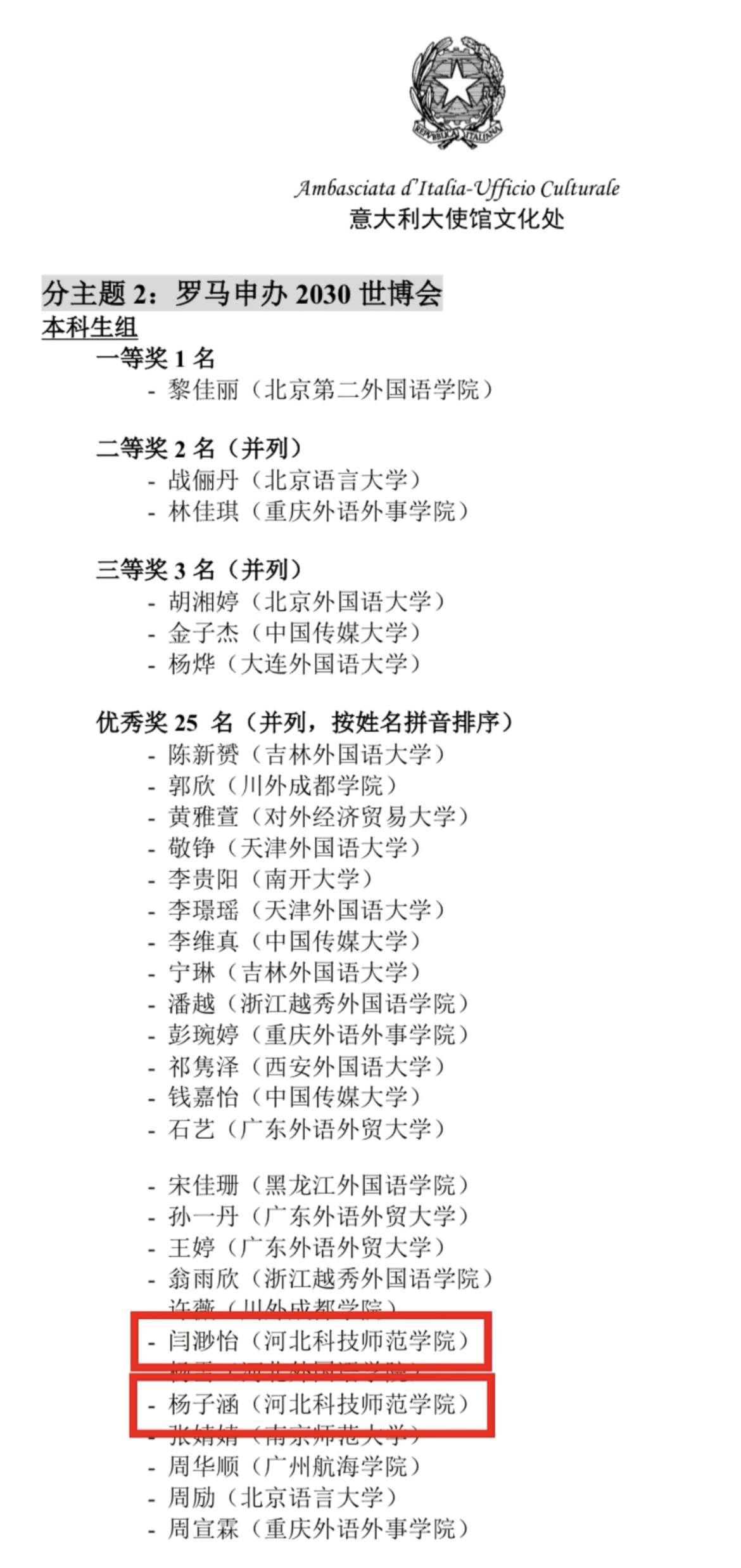 近日,2023年第八届全国“ITALIA CIAO/意大利语桥”大赛圆满落幕,本届大赛的总主题为:意大利语与可持续性,下设“纪念卡尔维诺诞辰100周年”与“罗马申办2030世博会”两个分主题,以写作大赛的形式举行。本次比赛有来自北京外国语大学、上海外国语大学、广东外语外贸大学、南开大学等23所高校的74名学生参赛(其中本科生组50名,硕士生组24名)。BEAT365选手韩田雨同学,凭借扎实的意大利语专业能力,荣获本科生组二等奖。BEAT365另外两名选手闫渺怡、杨子涵获得优秀奖。