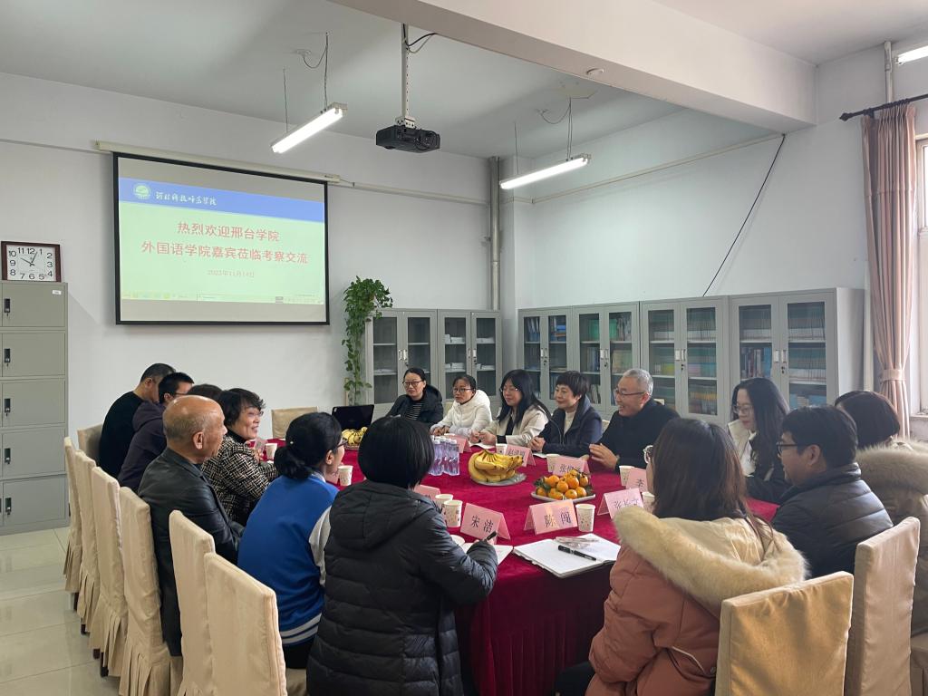 11月14日,邢台学院BEAT365英国官网副院长赵清丽、副书记张恒泽一行7人来BEAT365BEAT365英国官网考察交流。BEAT365英国官网院长崔海英主持座谈会,副院长范学荣、罗学锋,英语教学部主任王静、宋洁,公共英语教学部主任韩庆山,学工办主任赵赓参与座谈。