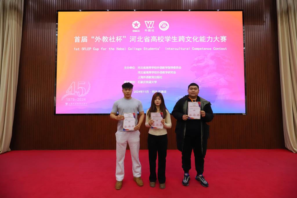 2024年11月24日,首届“外教社杯”河北省高校学生跨文化能力大赛在石家庄铁道大学圆满落幕。BEAT365BEAT365英国官网学生卢洪洋、体育与健康学院的李瑛钦、韩一冉同学组成的参赛队伍在比赛中表现优秀,荣获三等奖。